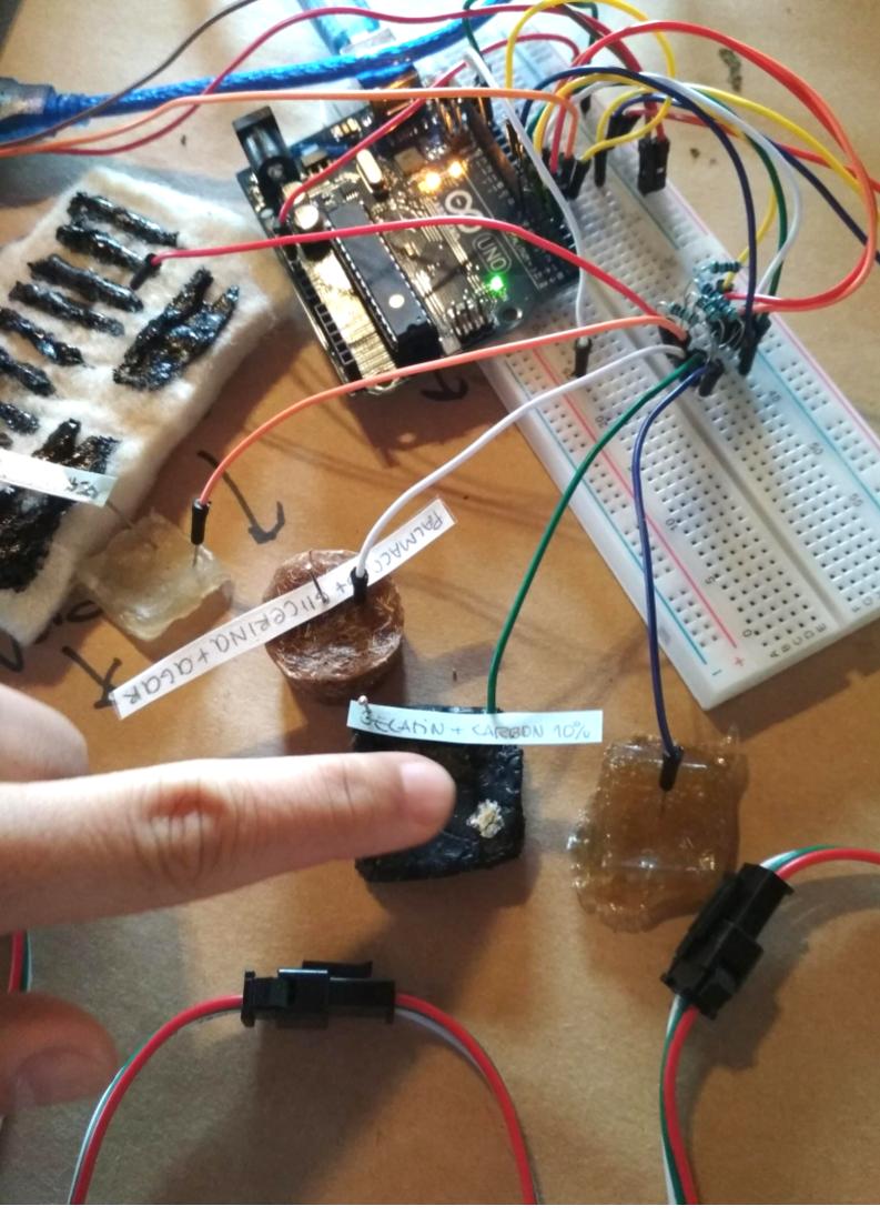 Desarrollo prototipos de materiales, componentes y dispositivos que sean inusuales en el imaginario de la tecnología pero que sean altamente biodegradables, fácilmente extraibles de cualquier entorno y altamente reapropiables y replicables.Mi experimentación me lleva a cocinar una célula solar en base a gelatina, hacer baterías de masa madre y otros fermentos, sensores de humedad con piezas de lana, sensores capacitivos y de proximidad con ceniza y algas….